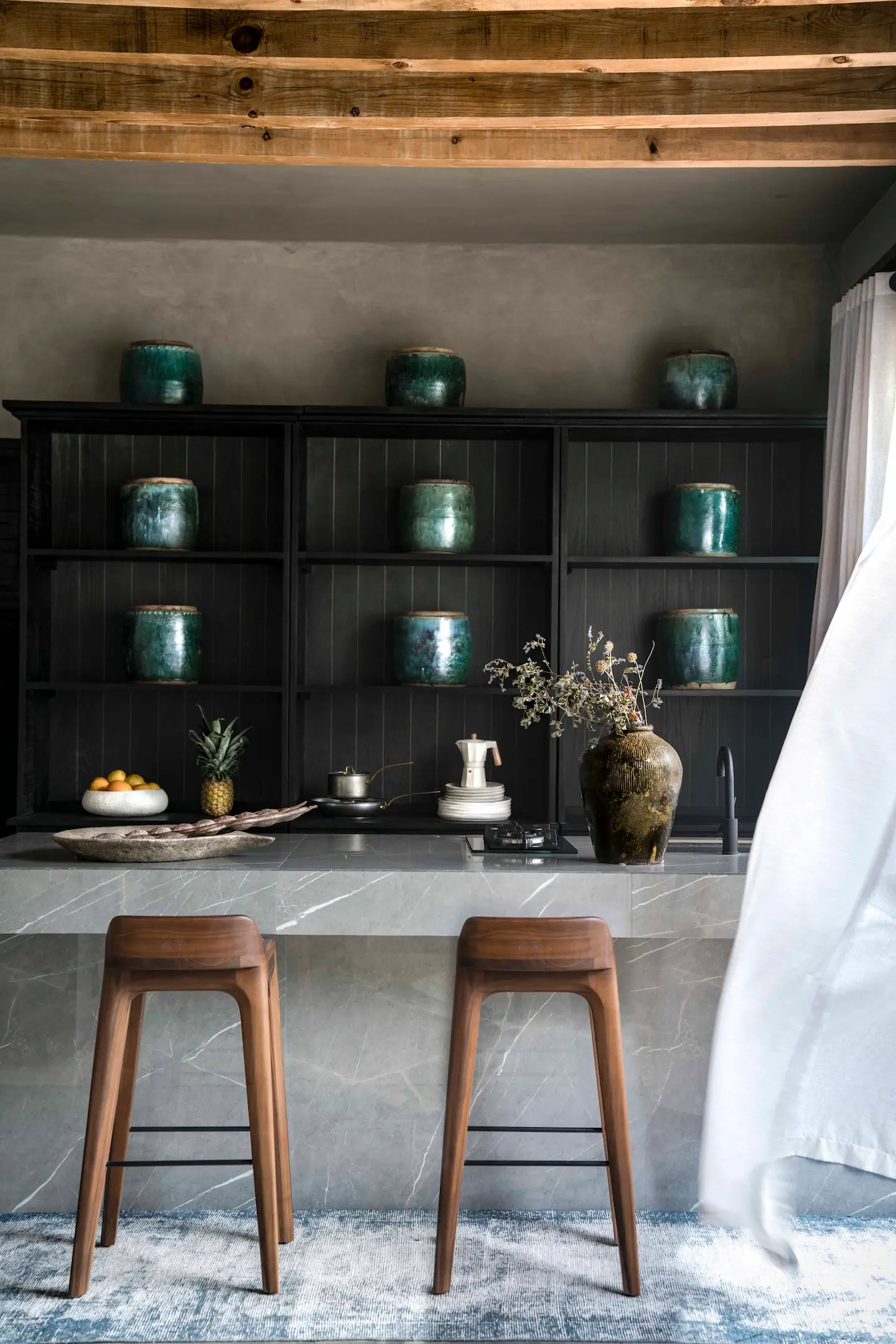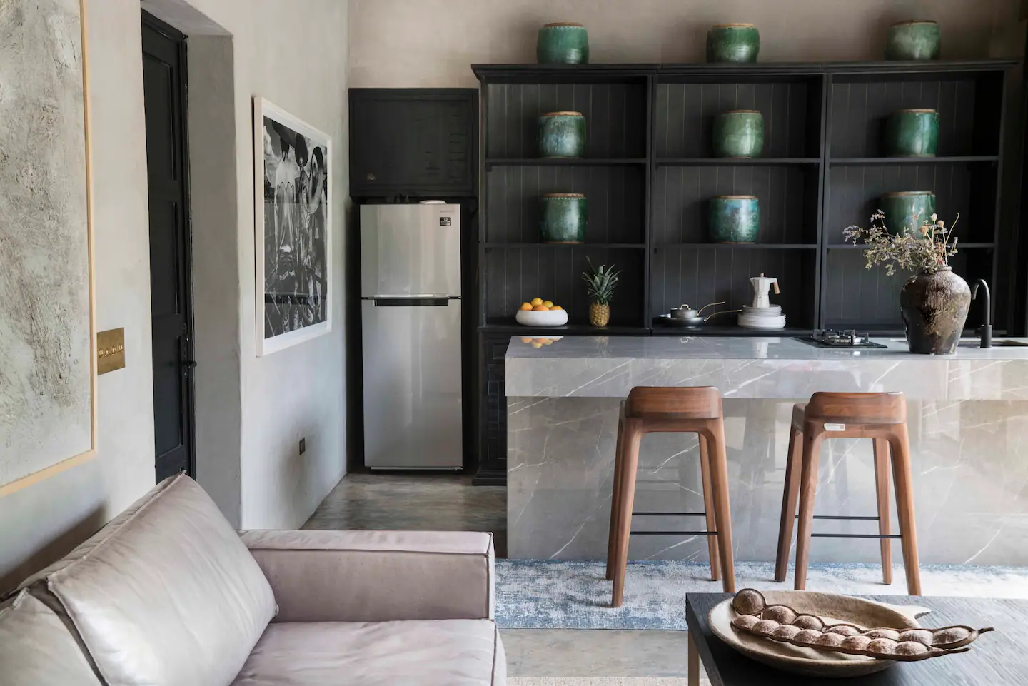 El diseño sigue un esquema en forma de «V», donde un ala alberga la recámara y el baño, mientras que la otra contiene la cocina y la sala de estar. En el centro de este diseño se encuentra la alberca exterior, rodeada de olivos y árboles de granada, ofreciendo una perfecta integración con el paisaje. Las vigas expuestas y los muros de concreto celebran el proceso de construcción, complementados por la exquisita decoración de Namuh, una firma mexicana que aporta su estilo asiático a través de piezas que cuentan historias con sus materiales y procesos artesanales.